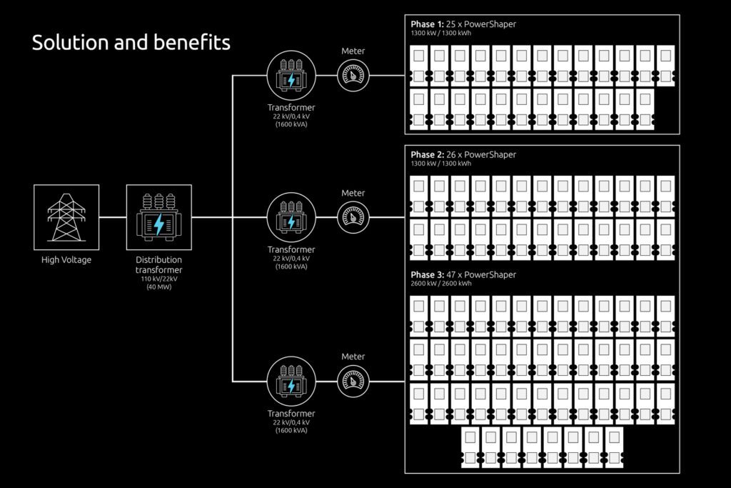 Phase 1: Installation of 25 Pixii PowerShaper cabinets, providing a total output of 1,250 kW and a capacity of 1,200 kWh. This initial phase was crucial for trading purposes and laid the groundwork for subsequent expansions.