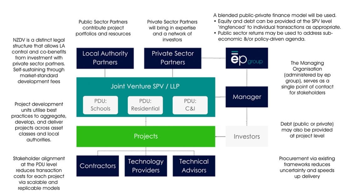 The NZDV is a strategic partnership, and the governance structure between local authorities and private sector partners is designed to catalyse private finance into local net zero delivery in a way that is fair and equitable to all parties involved. Local authorities will have varying appetites for risks and rewards, therefore the NZDV can be structured to cater to specific local authority requirements to maintain strategic place-based policy influence, whilst ensuring transparency in operational decision-making.